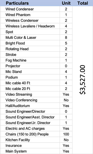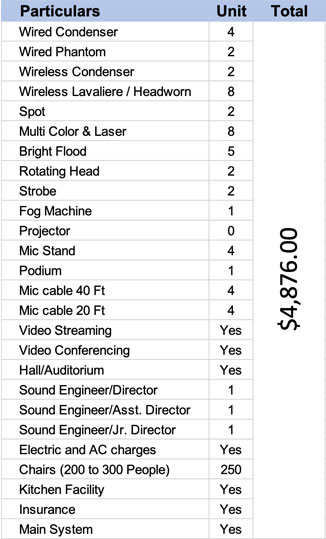 This Auditorium stage sound system provides 360° of incredible audio coverage with a high -performance range upto 144db.Wirelessly stream audio with your Bluetooth-enabled device or connect your existing audio/video equipment such as a projector, USB drive, SD card,CD/DVD player, laptop or computer via the mixer amplifier. This sound system is perfect for where powerful, high-quality audio is needed.It also includes careful sound isolation from nearby spaces and a very quiet mechanical(HVAC)system with audio and projection to support your event.